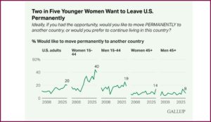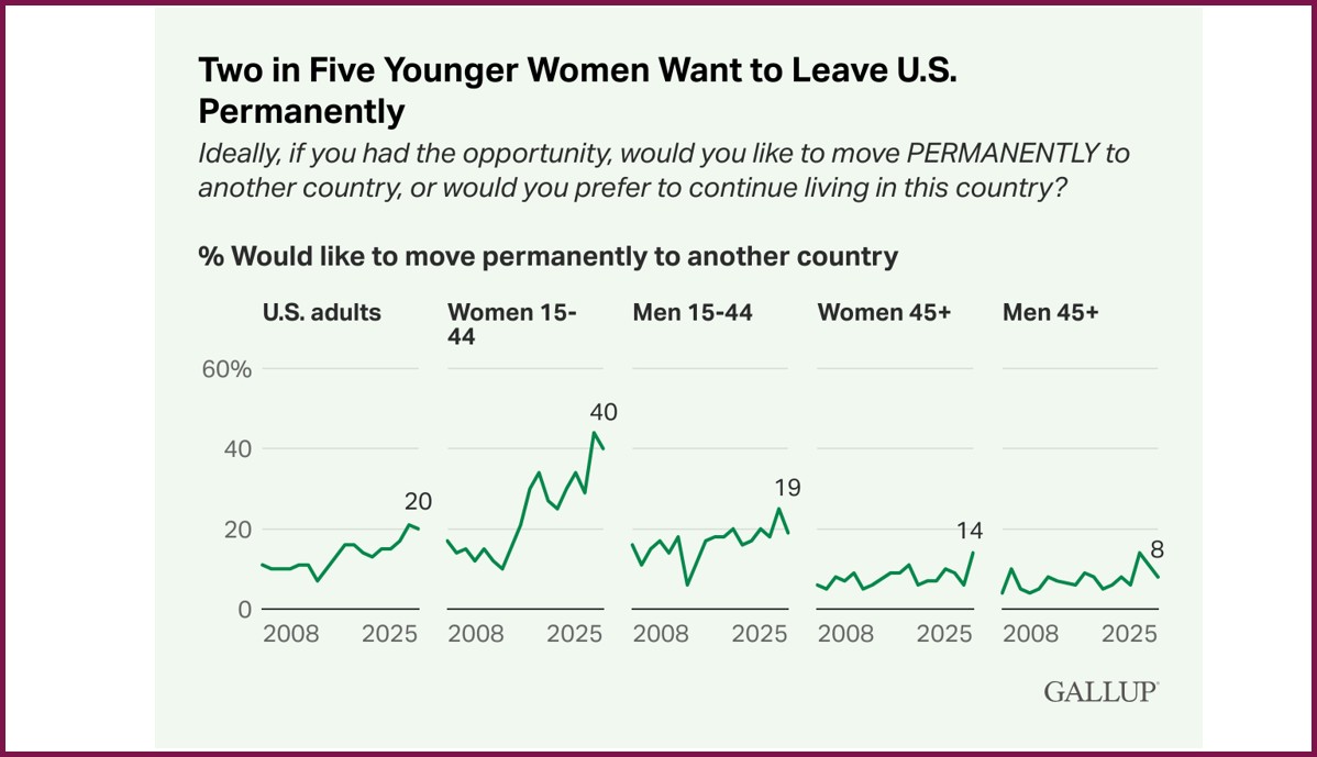 Desire to migrate outside the United States has tripled among young women in the last decade, and risen with older women as well. Meanwhile 450,000 women have left the labor market since January 2025, with the steepest decline among young mothers.